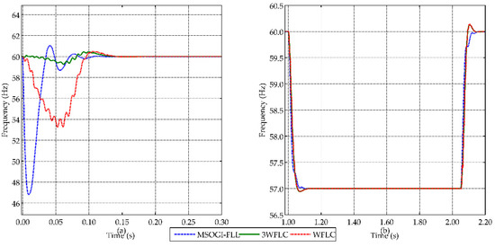 In Figure 6a, after the measuring starts, the three strategies presented an overshooting until synchronization at 12.5 ms. The maximum overshoot presented was 47 Hz, 54.5 Hz and 59.5 Hz for MSOGI-FLL, WFLC and 3WFLC respectively. In Figure 6b, the three strategies achieved similar behavior, synchronizing with the new frequencies at 1.15 s and 2.15 s. The WFLC and 3WFLC had a 60.15 Hz overshoot, while MSOGI-FLL did not have any overshoot.