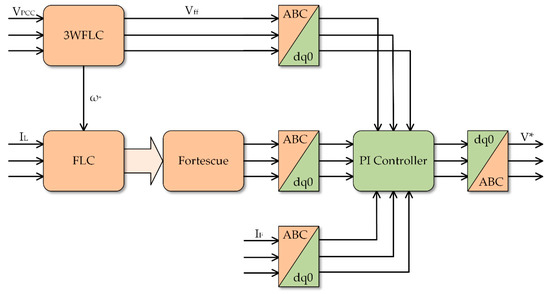 The SAPF controller and gating signal generator is inspired in SDFLC + 3WFLC structure developed in Section 2 with modifications due to the nature of the application. Figure 8 presents the SAPF controller. In Figure 8, V* represents the reference voltage output, and  denotes the output frequency of 3WFLC. The PI Control was implemented in dq0 reference and uses the feed-forward signal Vff to synthetize the output voltage for PWM, controlling the output filter current IF. The harmonics and sequence currents selected to be filtered are added and fed to a PI controller input. The result at the PI output is used as the reference for the SPWM to generate the pulse signals for the converter.