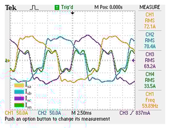 In first scenario, ES1, the system was developed without the SAPF. The load and source parameters correspond to those presented in Section 4. Figure 10 presents the 3-phase and neutral source current, which corresponds to load current. The second scenario, ES2, includes the SAPF to compensate all load harmonic currents with maximum power consumption. Figure 11a shows 3-phase and neutral source current, Figure 11b shows the three-phase and neutral output filter current, Figure 11c compares phase-a source, load, and output filter currents (CH1, CH2, and CH3 respectively) and Figure 11d compares neutral source, load, and output filter currents (CH1, CH2, and CH3 respectively).