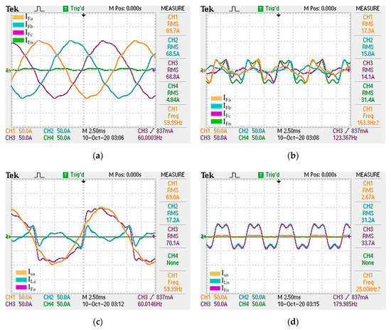ES3 scenario. (a) 3-phase and neutral source current. (b) Output Filter Current. (c) Source, load and output filter phase-a current. (d) source, load and output filter neutral current. Current scale is configured to 50 A/div and time scale is configured to 2.50 ms.