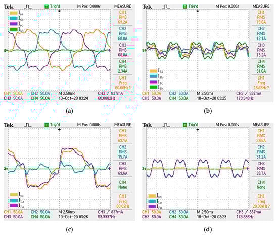 In the third scenario, ES3, the SAPF compensates the unconventional sequence components of second and third harmonic scenarios and zero-sequence components. Figure 12a shows the three-phase and neutral source current, Figure 12b shows the three-phase and neutral output filter current, Figure 12c compares phase-a source, load, and output filter currents (CH1, CH2, and CH3, respectively) and Figure 12d compares neutral source, load, and output filter currents (CH1, CH2, and CH3, respectively).