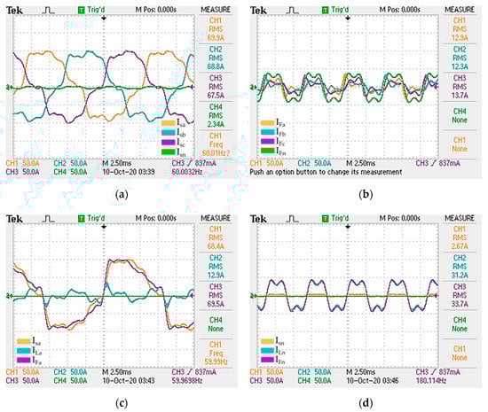 In the last scenario, ES4, the SAPF only compensates zero-sequence components, looking for a lower active power consumption. Figure 13a shows the three-phase and neutral source current, Figure 13b shows the three-phase and neutral output filter current, Figure 13c compares phase-a source, load, and output filter currents (CH1, CH2 and CH3 respectively), and Figure 13d compares the neutral source, load, and output filter currents (CH1, CH2 and CH3 respectively). The harmonic content in all scenarios, THD measured, and power consumption of the filter are shown in Table 7.