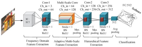 First, the input HDR image is first converted to DCT coefficients by multi-channel discrete cosine transform block, and then a convolutional layer named Conv1 extracts features from the DCT coefficient matrix. The extracted features are processed with Batch Normalization (BN) [] and ReLU as input of adaptive multi-scale convolution module. This part is represented by Frequency Domain Feature Extraction in Figure 1. The adaptive multi-scale feature extraction process is represented by Adaptive Multi-Scale Feature Extraction in Figure 1. The multi-scale features extracted by AMSC module are processed with BN, ReLU, and max pooling. Then, a two-layer convolutional stream with max pooling and activation function is used for high-level feature extraction, represented by Hierarchical Feature Extraction in Figure 1. To introduce the adaptability of input with different sizes to the network, average pooling is used to downsample the feature map to a fixed size. Finally, a fully connected layer with Softmax activation function is used to implement the classification. Table 1 indicates the outline of the proposed DCT-CNN. Multi-channel discrete cosine transform and adaptive multi-scale feature extraction will be discussed in detail in Section 3.2 and Section 3.3.