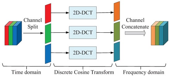 This approach reduces the dimensionality of input data at the cost of losing part of the information related to HDR source forensics to a certain extent. To improve the accuracy of HDR source forensics, all image information must be fully used. In the proposed method, for the sake of preserving the information in each color channel and converting the input HDR image into the DCT domain, a multi-channel discrete cosine transform as shown in Figure 2 is used. More specifically, the input multi-channel HDR image is split into three channels, denoted by the Red channel, the Green channel and the Blue channel. In addition, DCT is performed on each color channel separately to obtain three individual DCT coefficient matrices. Finally, the three DCT coefficient matrices are concatenated into a 3-channel DCT coefficient matrix. It should be emphasized that the output DCT coefficient matrix has the same size as the input HDR image. Therefore, we can see that the method proposed in this paper is different from the other two DCT-based methods. In Referrence [], the DCT coefficients matrix is multiplied by a weight matrix with values increasing from the upper left corner to the lower right corner. At the same time, some low-frequency DCT coefficients and high-frequency DCT coefficients in the DCT coefficient matrix are discarded. In Reference [], the DCT transform is performed on the median filter residual of an image, which discarded the image information before the DCT operation. The method proposed in this paper uses MC-DCT to retain information in multiple color channels without discarding image information of DCT coefficients. Therefore, the proposed method theoretically has better performance than the other two DCT-based methods.