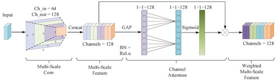 The adaptive multi-scale feature extraction module is shown in Figure 3. Multiple scale features are extracted using a multi-scale convolutional layer, and these features are weighted by a channel attention mechanism. Convolutional layers with different kernel sizes enable CNN to extract features related to HDR source forensics from diverse scales. In this work, channel attention mechanism is used to assign weights to the features extracted by the multi-scale convolutional layer. This adaptive multi-scale feature extraction block can emphasize features that are positive for forensics and suppress irrelevant features by applying channel-wise weights to every channel of multi-scale feature.