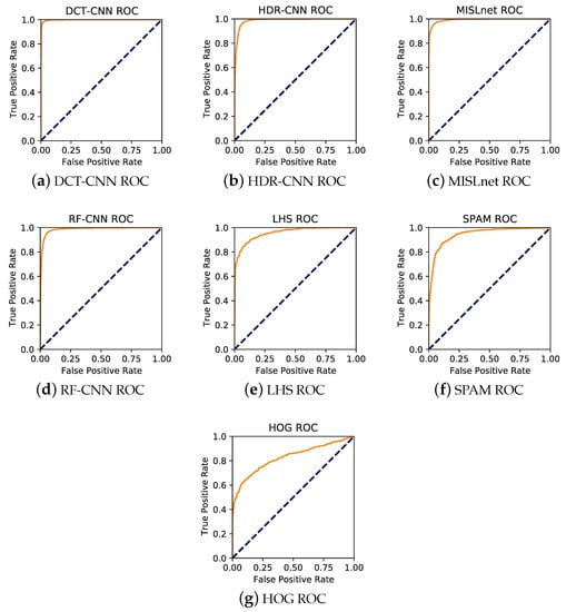 ROC of different methods. (a) ROC of the proposed DCT-CNN; (b) ROC of HDR-CNN; (c) ROC of MISLnet; (d) ROC of RF-CNN; (e) ROC of LHS; (f) ROC of SPAM; (g) ROC of HOG.