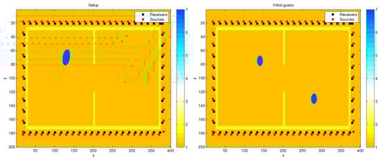 The example setup considered here is illustrated in the left image of Figure 1. We model a 2D domain of discretized by a pixel grid of pixels each having a physical size of . A small building is composed by two distinct rooms separated by the presence of outside and one interior walls. Each wall has a width of and a relative permittivity of . As already mentioned, in our study the building is considered empty for simplicity except of the targets which are assumed here to have a permittivity value . The background space is filled with air having value . The conductivity is assumed constant and equal to everywhere. The conductivity and free space permittivity will not be part of the inverse problem. We mention that a more complex static background, possibly also incorporating more than one physical parameter, can be estimated in an off-line procedure by a similar process as applied here for the targets. In principle, also static and dynamic content could be reconstructed simultaneously using the same parametrised setup. However, in our opinion, it does make sense to separate those different content types and use different level set representations for the background and for the targets. Therefore, in this paper, we will only consider the dynamic tracking part. Actually, we only consider one given time step of this dynamic estimation, where the dynamic aspect is only considered as a constraint in available processing time for obtaining a fast approximate estimation of the location of a target. We will not explicitly incorporate correlations over time between different frames, as it can be done by making use of Kalman Filter techniques for example. Those have been addressed in different publications, see for example [2,4]. We plan to combine those different aspects of a time-dependent inverse problem in our future research. Moreover, we refer the reader for more details on how to estimate the static background distribution to our earlier publications, in particular [3,7,8,9].