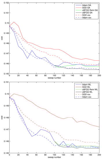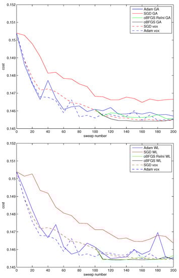 In order to evaluate the sensitivity of the discussed optimization schemes to this crucial parameter, we have performed an additional set of simulations in which we increase the interval of permitted step sizes in the line search. To be precise, we have doubled the extreme values of . The corresponding cost evolution curves are displayed in Figure 5.