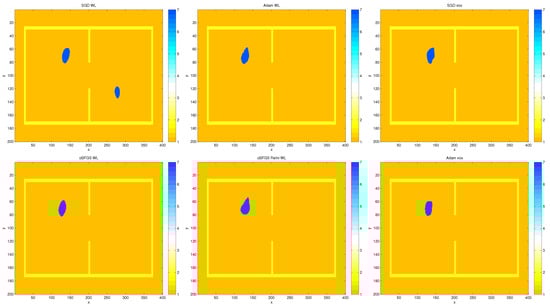 Although Figure 5 leads to general conclusions similar to our previous discussion, some differences emerge as well. For example, as a consequence of the extension of the interval , the shapes are allowed to change more significantly, yielding a rapid convergence especially at the beginning of the evolution. However, as expected, this also comes with some instabilities in the final part of the simulations as confirmed by the more irregular behaviours of the cost evolution compared to the trends depicted in Figure 2. Certainly, an adaptive selection of step sizes, e.g., being reduced with increasing iteration number, recommends itself here. Such an approach has been applied in a different application of low-frequency electromagnetic imaging in [26,27] with very good success. However, a similar more detailed study of adaptive line search techniques for the application in stochastic shape optimization schemes for through-the-wall radar imaging is beyond the scope of this paper.