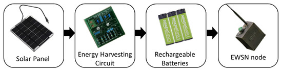 Wireless Sensor Networks (WSNs) have extensive popularity in the field of environmental monitoring [1,2,3,4,5]. Recently, an Environmental Wireless Sensor Network (EWSN) has been exceptionally enhanced due to the development of the Internet of Things (IoT) [6]. EWSN nodes are deployed in open areas (e.g., forests); accordingly, they are not connected to the main power supply because of high wiring cost and difficulty. Instead, an EWSN node usually depends on a rechargeable or non-rechargeable battery to operate; while a non-rechargeable battery requires regular replacement, a rechargeable battery can be recharged by energy harvesting and thus more reliable and effective in the long-term cost [6]. A high capacity battery can be used to lengthen the period of successive replacement or recharging, but it typically increases the node size and weight [7,8]. Alternatively, an energy harvester can be utilized to scavenge the surrounding ambient energy (such as heat, electromagnetic, motion, and light energy) and convert it to electrical energy that charges a battery and thus powers an EWSN node [9,10].