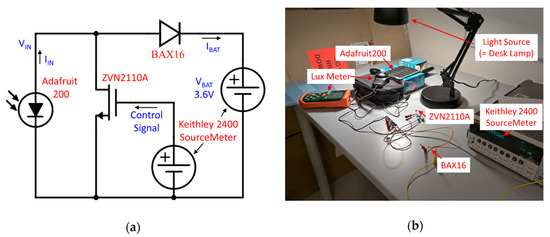 Figure 2. Primitive solar energy harvester. (a) Circuit diagram of the harvester. (b) Testbench of power measurements.