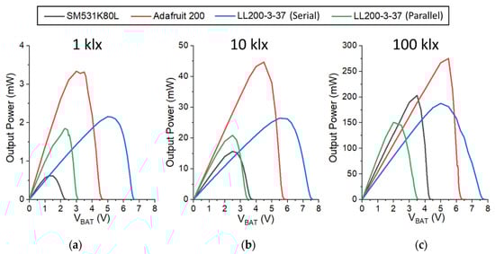 Figure 3. Measured output power of the primitive harvester circuit with four different solar panels at different light conditions: (a) 1 klx; (b) 10 klx; (c) 100 klx.