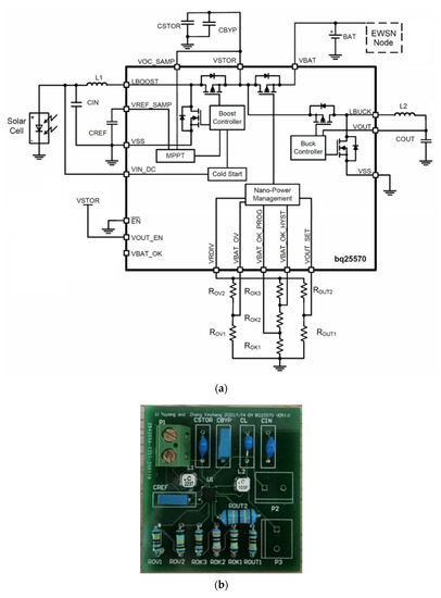 Figure 4. Energy harvester based on bq25570. (a) Circuit diagram (modified from [36]). (b) Designed harvester.