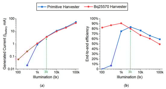 Figure 5. Measured energy harvesters with different illuminations: (a) generated current; (b) end-to-end efficiency.