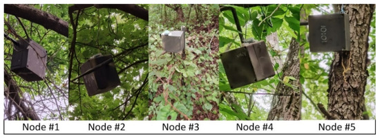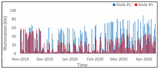 HOBO Pendant MX loggers (MX2202) are attached to each node and collect light intensities every 5 min for more than 5 months (11/2/2019–4/17/2020). Figure 7 plots the measured light intensities from the MX2202 for Nodes #1 and #5 as examples. The measured light intensities are different since the orientation of the nodes and the shade conditions by trunks, branches, and leaves are different.