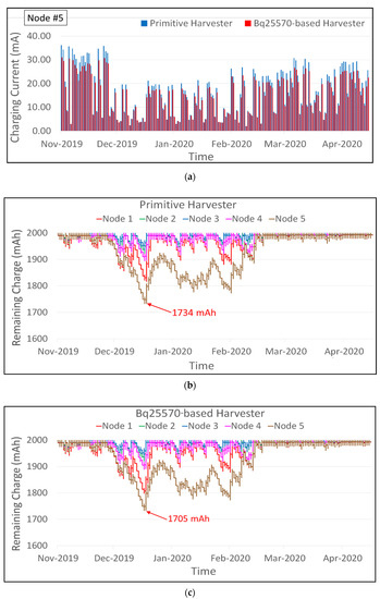 Figure 8a shows the calculated harvested current, at Node #5 with the weakest light condition among the five nodes, for the primitive harvester in the blue line and the bq25570-based harvester in the red line, based on measurement results of the harvester itself (Figure 5) and environment light intensity (Figure 7). Figure 8b,c show the predicted remaining charge of the batteries every 5 min. The remaining charge is predicated by adding the estimated harvested charge (‘generated current’ × 5 min) and subtracting the average charge consumption of 0.125 mAh every 5 min. However, it takes into consideration that the battery charge does not exceed the maximum capacity of 2000 mAh. The remaining charge is different among the nodes since light intensities are different, as shown in Figure 7 with the examples of Nodes #1 and #5.