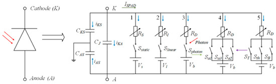 - Huang, D.; Zhu, R.; Liu, S.; Sun, W.; Wu, J.; Ma, D. SPICE Modeling for Single Photon Avalanche Diode. In Proceedings of the SPIE 5th International Symposium on Photoelectronic Detection and Imaging (ISPDI)-Imaging Sensors and Applications, Beijing, China, 25–27 June 2013; Volume 8908. [Google Scholar]