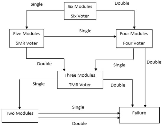The hexa modular redundancy (6MR) fault-tolerant technique [7,10] can detect this specific sequence, as well as additional failure sequences. 6MR follows the same methodology as TMR and 5MR. Six identical copies of the module (M) are connected to an error detection and recovery mechanism. 6MR can tolerate 4 module failures as follows: (1) 4 successive single failures in 4 different Ms, (2) a single failure followed by a double failure followed by another single failure, and (3) a double failure followed by 2 successive single failures. These failure sequences of 6MR are explained in Figure 1. The failed modules can be recovered using DPR.