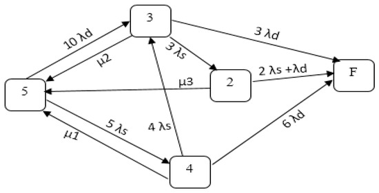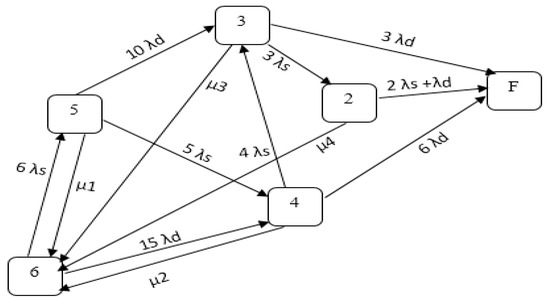 In this subsection, the reliability was studied for the 5MR and 6MR fault tolerance techniques using different ratios between λs and λd as the ratio may be 10 or less [17,18]. Figure 2 and Figure 3 show Markov models for 5MR and 6MR [10,19].
