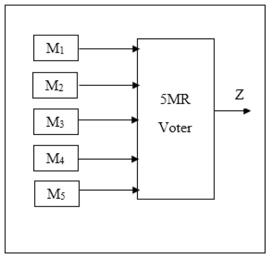 In this subsection, we discuss the penta modular redundancy (5MR) voter implementation. The 5MR voter is implemented in addition to its modules (Mi) on the same FPGA, as shown in Figure 4.