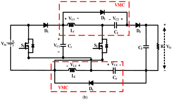 Coupled inductor topologies have a high voltage gain, higher efficiency, and reduced voltage and current stresses across switches. The problem with coupled inductor topologies is that energy trapped in the leakage inductance needs to be recycled to avoid voltage transients across the switch and increase the circuit’s overall efficiency. For this, an additional clamped circuit needs to be designed for these topologies [15,16,17,18], which increases the circuit’s complexity. A new triple mode converter is proposed in [19], but many switches and inductors are required to obtain high voltage gain. The converter in [20] uses a Cockcroft-Walton based VMC to increase the gain of the converter. A new converter boost converter with VMC with switched capacitors is presented. The topology uses only a single inductor with switched capacitors, but the voltage gain [21] is limited. At lower duty ratios, the gain is little. Interleaved boost converters are characterized by a low ripple in current and low stress across the switches but require multiple VMCs (Voltage Doublers, Dickson Cells) at the output to boost the voltage.
