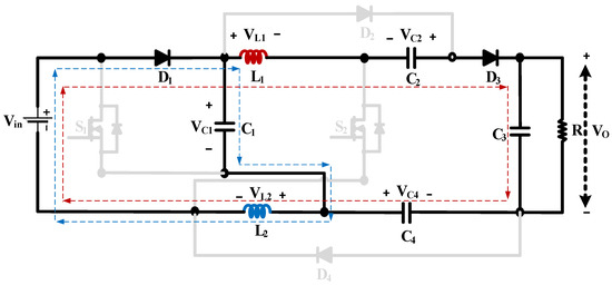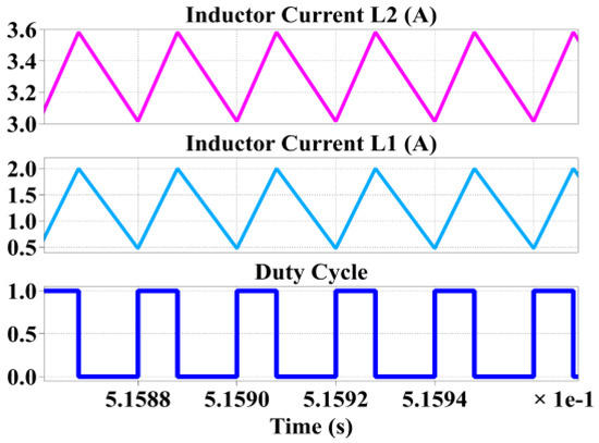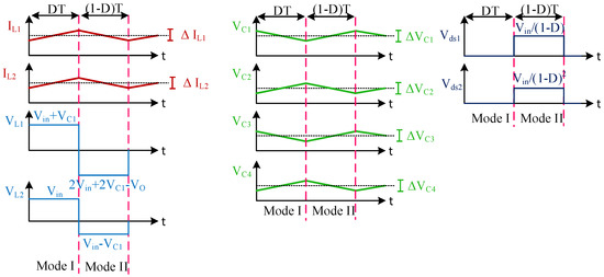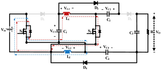 The voltage stress across S1, S2, D2, and D4 is obtained by applying KVL during the second mode of operation, as shown in Figure 4. The voltage stress across diodes D1 and D3 could be obtained by applying KVL during the first mode of operation. The voltage stress and current across the switches and the diodes are shown in Table 1. It can be inferred from Table 1 that the voltage stress across switches and diodes is much less than the output voltage, which makes the converter highly efficient. The low voltage stress across capacitors, switches, and diodes and the high voltage gain at lower duty ratios is the distinguishing feature of the proposed converter, making it superior to the literature’s proposed topologies.