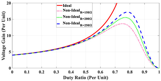 Using Equation (15), the proposed converter’s non-ideal voltage gain is calculated with the inductor’s parasitic resistance, which is 0.3 Ω for each inductor. The results are compared with the ideal conditions and presented in Figure 5. At lower duty ratios, both the ideal and real voltage gains are the same, but as the duty ratio increases, the deviation between these two becomes large. Further, the deviation increases with the decrease in the load resistance because a reduction in the load resistance increases the current in the circuit, which increases the power loss in the circuit. As the duty ratio is increased, the current in the circuit also increases, which increases conduction power loss in the circuit. Due to this reason, the efficiency of the DC-DC converters decreases at higher duty ratios, and the output voltage gain starts decreasing after reaching its maximum value. It is always recommended to use these converters below a certain value of a duty ratio.