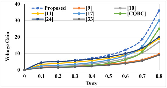 Comparison of Voltage gain vs. Duty ratio of proposed converter with other converters.