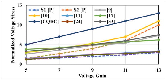 This section compares the proposed topology with some other recent structures of step-up converters. The proposed topology is compared with topologies with quadratic gain and ultra-high gain boost converter [24]. Table 2 shows the overall comparison of the proposed topology with other recent topologies, where N denotes the number of components. As depicted in Figure 6, the proposed topology has the highest gain in the entire operation range in the non-isolated category of converters with 12 components. The topology’s gain in [9] is less than the proposed converter, although it utilizes four inductors and a total of 14 components. The ultra-high gain boost converter is proposed in [24] and employs 12 components, but its gain is less than the proposed topology. The normalized voltage stress curve versus voltage gain is shown in Figure 7. The switch S1 has the lowest stress across all compared to the stress on all other topologies. The voltage stress across S2 is greater than S1, but for the voltage gain up to 10 times, it is lower than the stress of the converters in [9,10], [CQBC], and [33].
