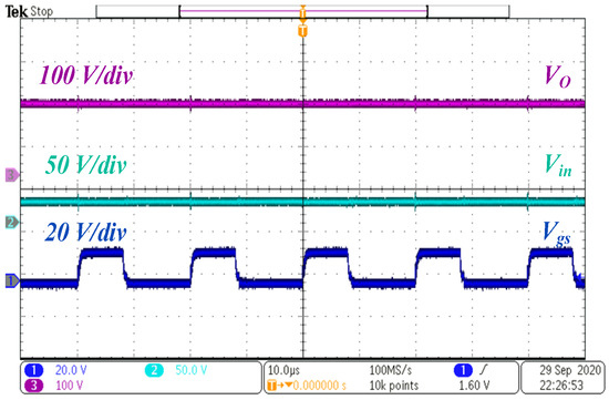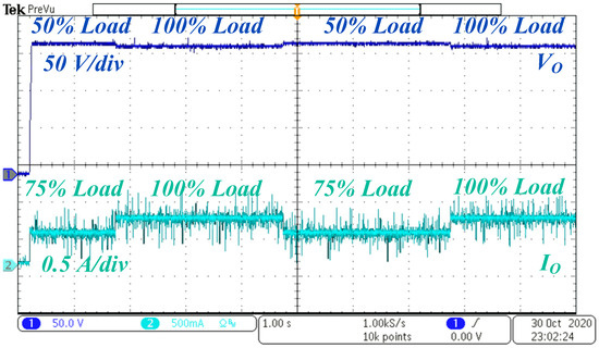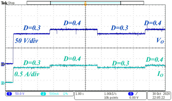 The dynamic conditions are presented in Figure 20 and Figure 21. While changing the duty ratio, the load resistance is kept constant at 200 Ω. With the increase in the duty ratio, the voltage gain increases without any transient, as shown in Figure 20. To capture the dynamic load change, the electronic load is set to change its load between 100% and 75% of the rated load, and the duty ratio is kept constant at 0.4. With the increase in the load, the output current increases, which increases the internal power losses in the circuit, and output voltage decreases a little bit, as shown in Figure 21.