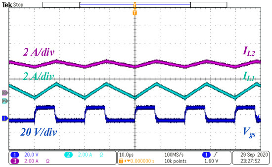 From the steady-state and dynamic performance, it can be observed that the converter is working satisfactorily in an open loop. The output voltage and currents obtained through experimental investigations closely match the theoretical and simulation results. Further, the stress across switches capacitors and diodes is less than the output voltage. The low voltage stress leads to the selection of devices with low voltage ratings, which ultimately improves efficiency and decreases the converter’s cost. The proposed converter is suitable for low and medium power applications. It is to be noted that the parasitic resistances of inductors decrease the voltage gain and the efficiency of the converter [38,39]. To increase the converter’s gain and efficiency at high duty ratios, a coupled inductor can also be used in the proposed topology instead of two separate inductors.