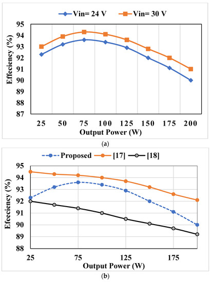 For an output power of 111.56 W, the efficiency is found to be 92.82%. The variation of efficiency with output power is shown in Figure 19a. The efficiency of the converter increases as the input voltage is increased. This increase in efficiency is because at higher input voltages, a small duty ratio is required to get the same amount of voltage gain, and hence conduction losses are significantly reduced. In Figure 19b, the comparison of efficiency at an input voltage of 24 V is shown. The coupled inductor topology proposed in [17] has higher efficiency than the proposed converter.