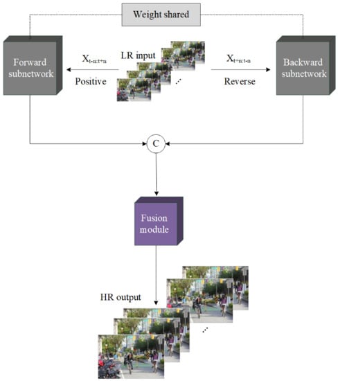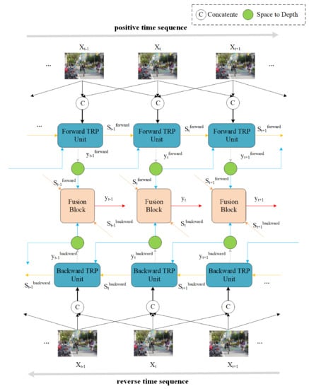 The overall network framework is shown in Figure 1. The structure and weight of the two subnetworks of BTRPN are precisely the same, and they process, respectively, the positive and reverse LR input video on the time axis, thus allowing the bidirectional temporal information flow. In the TRP unit, the method of progressive sampling is adopted to avoid the large one-step scale sampling. At the end of BTRPN is a fusion module with the channel attention mechanism, through which the features of the two sub-networks are combined, and the reconstructed video frames are output.