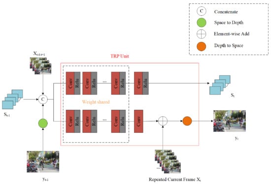 The TRP unit is illustrated in Figure 2. The input of the TRP unit is composed of a three section cascade: consecutive video frames (the current frame is in the middle), the temporal status of the last moment , the result of Space to Depth processing of the reconstructed output from the last moment . The output of the TRP unit is the temporal status of the current moment and the SR result of the current frame .
