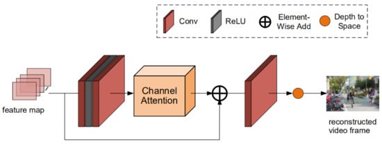 In the formula, and , respectively, represent the input feature vectors of the fusion module and the final reconstruction results. CA(·) represents the channel attention mechanism. ReLu(·) represents ReLU nonlinear activation unit. D2S(·) represents Depth to Space. W represents the weight matrix. Subscripts 1, 2 and 3, respectively, represent the three convolutional layers from shallow to deep in the fusion module, and the superscript represents the size of the convolution kernel.