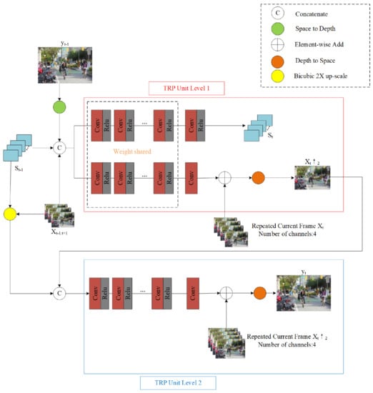 For the image SR work, one-step mapping on the large scale factor means that the optimization solution will be carried out in a more extensive solution space compared with small scale factors, which will increase the difficulty of model learning and affect the final image. Network design needs to avoid one-time large scale mapping, as much as possible in the form of multiple small scales (2×) mapping. Therefore, we propose a progressive improved TRP version, as Figure 7 shows. For 4× enhancement, We used two 2× TRP units level 1 and level 2. The TRP Unit level 1 is the same as Section 3.2 describes. The input of TRP Unit level 2 is the consecutive video frames after interpolation, the temporal status of the last moment after interpolation, the result of Space to Depth processing of TRP Unit level 1 SR output . The final output is 4× SR result .
