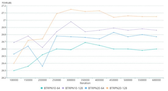 We construct multiple BTRPN networks of different depths and channels: BTRPN10-64, BTRPN10-128, BTRPN20-64, BTRPN20-128. 10/20 means that the network has 10/20 convolutional layers. 64/128 means that each convolutional layer channel is 64/128. Table 2 shows the performance of the four models for the 4× VSR. We can see that BTRPN20-128 has the best performance. The BTRPN20-64 has double-depth compared with BTRPN10-64, but the performance was not significantly improved. However, the BTRPN10-128 with double numbers of channels compared to BTRPN10-64 has a significant performance improvement. It indicates that it is more useful for the shallow network to increase the channel numbers in each layer than deepen the network.