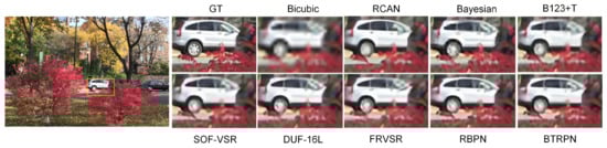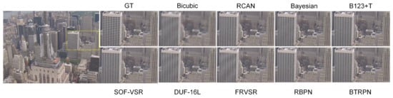 We compare the proposed BTRPN20-128 (referred to as BTRPN in the later section) with several the-state-of-the-art VSR algorithms on the VID4 dataset: VSRNet [], VESPCN [], DRVSR [], Bayesian [], B1,2,3+T [], BRCN [], SOF-VSR [], FRVSR [], DUF-16L [], RBPN [], RCAN []. Table 8 shows that our BTRPN network has the best average PSNR and the best average SSIM on the VID4 dataset. The qualitative result in Figure 9 and Figure 10 also validates the superiority of the proposed method. In the short video of the city, BTRPN restores the clearest building edge lines, which reflects that the BTRPN network with progressive up-sampling has a strong reconstruction ability of regular patterns. In the foliage video, compared with other methods, BTRPN, accurately captures the motion trajectory of the white car and achieves a good motion compensation effect, which again proves the effectiveness of BTRPN’s temporal propagation mechanism.