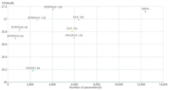 We compare the parameters and test times of BTRPN and other networks. We take the calendar clip in the VID4 dataset with 180 × 135 images input and 720 × 540 HR images output to record the test time for 4× enlargement. Figure 11 shows that BTRPN has achieved a good trade-off between model size and reconstruction effect. BTRPN makes an excellent reconstruction effect at only one-third of the size of the RBPN model. Compared with the same frame-recurrent type of FRVSR, BTRPN also obtains better video reconstruction quality with smaller network capacity. Table 9 shows that BTRPN has a distinct speed advantage compared with other methods.