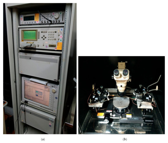 The contour of measurement system setup with (a): top-view sensed equipment and (b) 6” manual probe station.