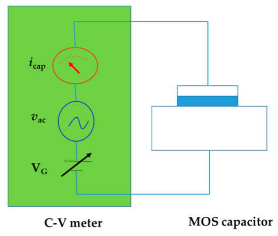 Considering the total gate capacitance in measurement, it can be treated as the case of queued oxide and semiconductor space charge capacitor, as shown in Figure 4 [39]. The total capacitance (CT) is calculated from icap/vac= ωCT, where ω is 2πf and f frequency. The CT in the MOS consideration is the small-signal capacitance, as shown in Equation (1).