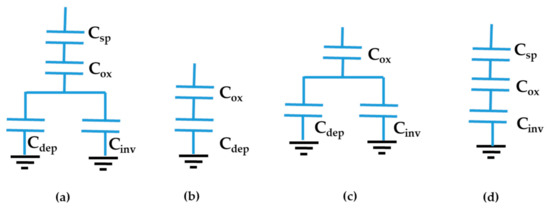 Equivalent circuits for C–V characteristics for MOS capacitor in the depletion or inversion region. (a) both depletion and inversion regions; (b) in the depletion region; (c) VG ≈ Vth; and (d) in the strong inversion region [39].