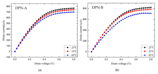 IDS-VDS characteristics for nMOSFETs with W/L = 10 μm/1 μm under different temperature stress: (a) tested device with decoupled-plasma nitridation (DPN)-A process and (b) with DPN-B process.