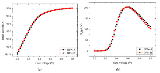 Before the C–V measurement, the I–V measurements are performed. The output characteristics of the tested nMOSFETs with W/L = 10/1 (μm/μm) on two groups of wafers are obtained by measuring the drain-to-source voltage (VDS) keeping gate-to-source voltage (VGS) constant at VGS = Vcc = 0.8 V, as shown in Figure 7. Meanwhile, the IDS–VGS curves for the two tested devices were obtained with VDS fixed at 50 mV to demonstrate the sweeping capability of these devices, and the transconductance Gm, represented as , is derived, as shown in Figure 8a,b, respectively. Furthermore, the electrical characteristics of gate leakage for three tested patterns with device type (W/L = 10 μm/10 μm), (10 μm × 100 μm) of bulk type, and finger-type MOSFET structure are scanned with the compliance current fixed, as shown in Figure 9. The source, drain, and substrate terminals for each tested device were grounded together in the measurement, while the VGS was swept from −1 V to 1 V in 25 mV steps. After checking the test results and considering the initial device design, the extracted performance seems normal in the specified tolerance.