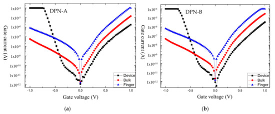 Gate leakage extraction for three tested devices: (a) with DPN-A process and (b) with DPN-B process.