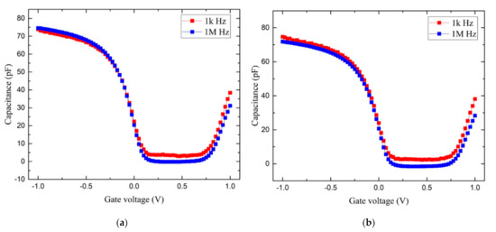 In the C–V measurement, considering the accuracy and stability of the measurement equipment, the finger-type pattern with an area of 6000 μm2 was chosen in this sub-section for all the test devices. Based on the IG–VG performance shown in Figure 9, the tested devices were acceptable and the C–V measurement could be applied. The C–V curves with low and high frequencies are shown in Figure 10. The thickness of the equivalent oxide of the entire gate dielectric through the extraction of C–V characteristics (CVC) software is approximately 22.4 Å, which is close to the expected value in the process specification.