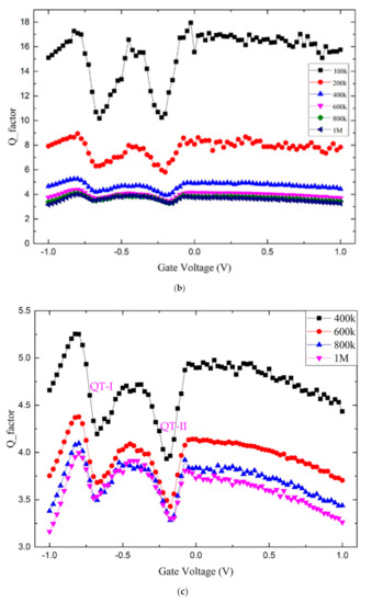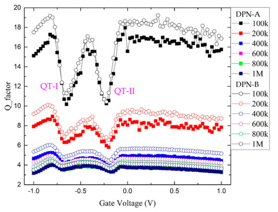 The Q-factor, as an index of charge or energy storage capability of a device or circuit, is useful to probe the device integrity in frequency response without considering just the DC term. Figure 11 shows the Q-factor performance for the finger-type DPN-A device. In Figure 11a, the frequency is swept from 20 kHz to 100 kHz as VGS scanned from −1 V to 1 V with 25 mV/step. The AC amplitude is 20 mV. To avoid the jumping phenomenon at low frequencies, the measured frequency is tuned onto 100 kHz to 1 MHz, as shown in Figure 11b. Because the value of the Q-factor at 100 kHz is larger than that in the others, the Q-factor performance under higher frequency response is re-drawn to reduce the suppression of visibility, as shown in Figure 11c. For that with the DPN-B device, the trend of the Q-factor distribution is similar to that in the DPN-A device. Hence, the comparison for both devices is shown in Figure 12 only in the frequency range of 100 kHz to 1 MHz. There are two prominent troughs, called Q-trough I (QT-I) and Q-trough II (QT-II), as shown in Figure 11c and Figure 12.