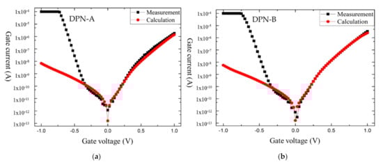 Gate leakage vs. gate voltage for device each type from measurement and calculation: (a) DPN-A device and (b) DPN-B device.