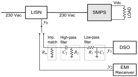 The widespread use of Switched-Mode Power Supplies (SMPSs) can be justified with flexibility, portability and better efficiency, including superior voltage regulation at the dc load. SMPSs feature various types of power electronic converters topologies, with conducted emissions that need to be assessed over a wide frequency range [1]. Conducted emissions caused by the switching process, in fact, originate from switching fundamentals of some tens of kHz and spread in the hundreds kHz and MHz ranges, well above the “classical” interval of harmonic and interharmonic penetration studies, limited in general to some kHz for 50–60 Hz systems. In the last ten years, attention has been extended to frequency intervals below 150 kHz [2,3,4,5,6,7,8,9], in general not currently regulated by electromagnetic compatibility (EMC) standards, focusing on the so-called “supraharmonics”. Some standards [10,11,12,13,14] deal with the 2–150 kHz interval, but do not cover explicitly SMPSs and other similar switching converters, thus taking into account the characteristics of the related signals. The approach of EMC standards to the quantification of conducted emissions is quite similar above and below 150 kHz: resolution bandwidth of 9 kHz and frequency sweep by a spectrum analyzer or EMI receiver is the reference approach. However, the use of time-domain sampling is a valid alternative for the many data acquisition boards and digital sampling oscilloscopes available, for the possibility of inspecting the “real” waveform when cross-checking the final results (especially in case of noncompliance) and the possibility of changing and tuning the post-processing methods.