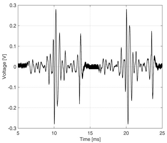 The switching byproducts responsible for the conducted emissions are superimposed to the mains sinusoidal voltage, located at its zero crossings. The signal y1 at the DSO input (qualitatively similar to the signal y0 as provided at the LISN output) is an intermittent waveform, deprived of the 50 Hz mains voltage component and of its low-order harmonics, also to improve the dynamic range. The zero-mean high-pass filtered signal is characterized by steep transients and rapid oscillations, as shown in Figure 2. The instantaneous frequency of oscillations is in the order of 20–30 kHz and is in relation to the internal switching frequency; the repetition rate is 100 Hz, twice the mains frequency.